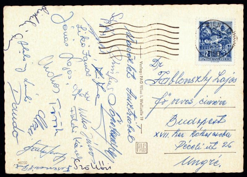 Beschreibung: A Volán SC (REAC) labdarúgó csapatának Bécsből hazaküldött képeslapja a csapat tagjainak aláírásával