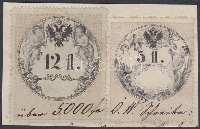 12fl + 5fl okmánybélyegek kivágáson https://www.darabanth.com/de/230-Fernauktion/230.0/Andere-Sammelgebiete/Stempelmarken~200028/12fl-plus-5fl-okmanybelyegek-kivagason~II1035033