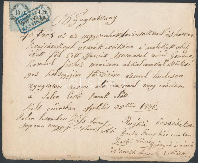 1865 Nyugtatvány 15kr fekvő vízjelű "E" + 4kr okmánybélyeggel, kék "VA... https://www.darabanth.com/de/230-Fernauktion/230.0/Andere-Sammelgebiete/Stempelmarken~200028/1865-Nyugtatvany-15kr-fekvo-vizjelu-E-plus-4kr-okmanybelyeggel-kek-VASMEGYE-ARVASZEKI~II1035498