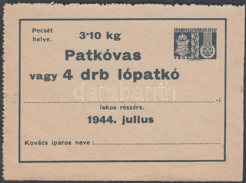 1944 Patkóvas vagy lópatkó ipari ellenőrző jegy https://www.darabanth.com/de/230-Fernauktion/230.0/Andere-Sammelgebiete/Stempelmarken~200028/1944-Patkovas-vagy-lopatko-ipari-ellenorzo-jegy~II1034969