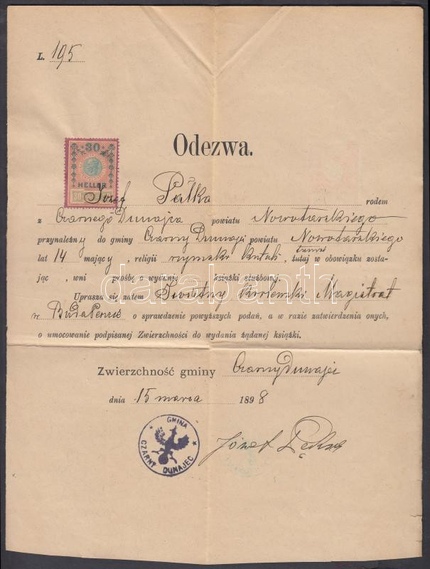 Lengyel nyelvű okmány osztrák okmánybélyeggel https://www.darabanth.com/de/230-Fernauktion/230.0/Andere-Sammelgebiete/Stempelmarken~200028/Lengyel-nyelvu-okmany-osztrak-okmanybelyeggel~II1035018