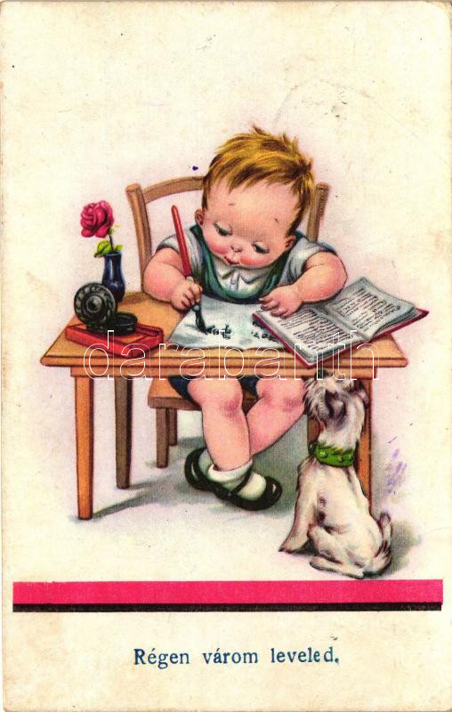 Régen várom leveled / writing letter, boy and dog https://www.darabanth.com/de/230-Fernauktion/230.0/Ansichtskarten/Kinder~75/Regen-varom-leveled-writing-letter-boy-and-dog~II1033060