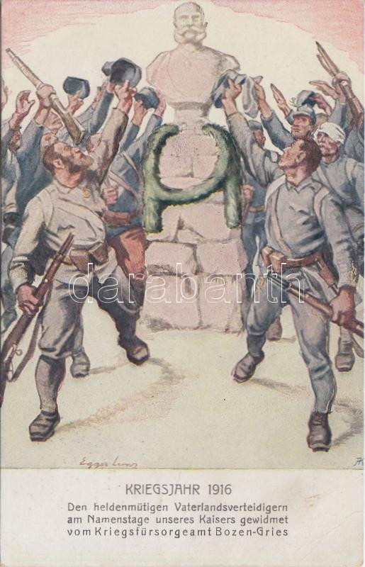 Beschreibung: 1916 WWI K.u.K. soldier with the statue of Franz Joseph, Rotes Kreuz, Kriegsfürsorgeamt Kriegshilfsbüro Nr. 568. s: Egger-Lienz (EK)