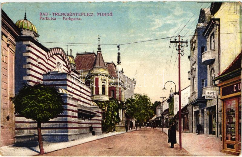 Trencsénteplic-fürdő, Park utca, cukrászda / Park street, confectioner... https://www.darabanth.com/de/230-Fernauktion/230.0/Ansichtskarten/Slowakei~6/Trencsenteplic-furdo-Park-utca-cukraszda-Park-street-confectionery-fa~II1031171
