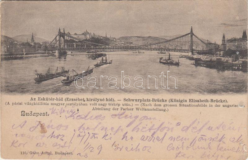 Budapest, Erzsébet királyné híd / Eskütéri híd, a párizsi világkiállít... https://www.darabanth.com/de/230-Fernauktion/230.0/Ansichtskarten/Ungarn~4/Budapest-Erzsebet-kiralyne-hid-Eskuteri-hid-a-parizsi-vilagkiallitas-magyar-osztaly~II1030388