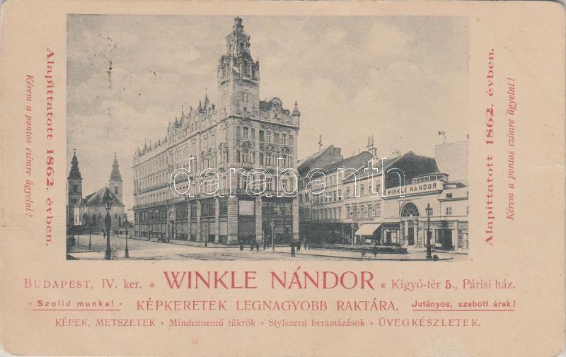 Budapest V. Winkle Nándor képkeret raktára, reklám; Kígyó tér 5., Pári... https://www.darabanth.com/de/230-Fernauktion/230.0/Ansichtskarten/Ungarn~4/Budapest-V-Winkle-Nandor-kepkeret-raktara-reklam-Kigyo-ter-5-Parisi-haz-fa~II1030514