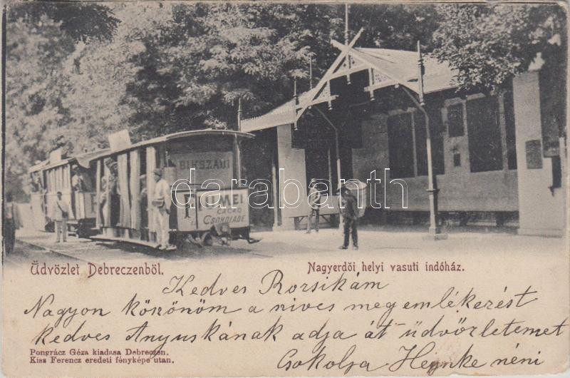 Debrecen, Nagyerdői helyi vasúti indóház, vasútállomás, Fiumei Cacaco és csokoládé reklám, kiadja Pongrácz Géza Kiss Ferencz eredeti fényképe után (Rb)