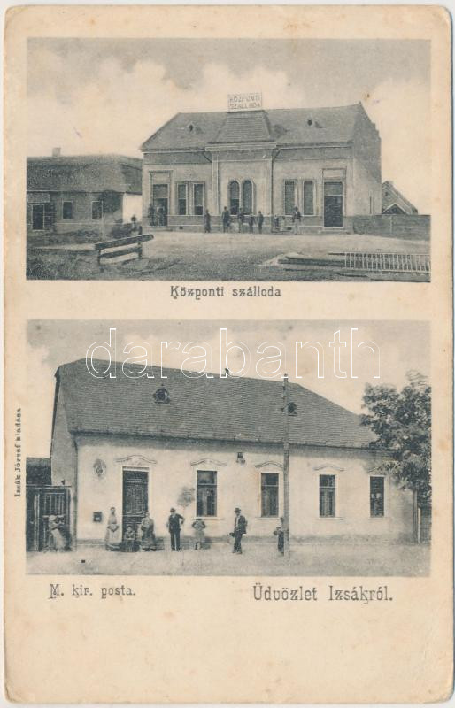 Izsák, Központi Szálloda, posta, Izsák József kiadása (EK) https://www.darabanth.com/de/230-Fernauktion/230.0/Ansichtskarten/Ungarn~4/Izsak-Kozponti-Szalloda-posta-Izsak-Jozsef-kiadasa-EK~II1037262