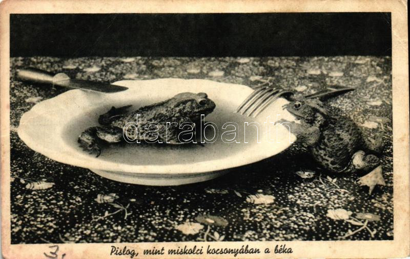 Miskolc, Pislog mint a miskolci kocsonyában a béka (EK) https://www.darabanth.com/de/230-Fernauktion/230.0/Ansichtskarten/Ungarn~4/Miskolc-Pislog-mint-a-miskolci-kocsonyaban-a-beka-EK~II1033926