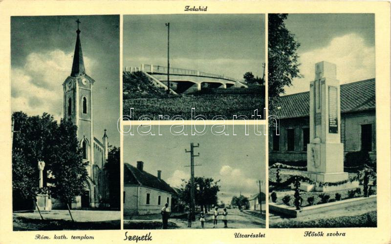Pókaszepetk, Római katolikus templom, Zala híd, Hősök szobra https://www.darabanth.com/de/230-Fernauktion/230.0/Ansichtskarten/Ungarn~4/Pokaszepetk-Romai-katolikus-templom-Zala-hid-Hosok-szobra~II1033605