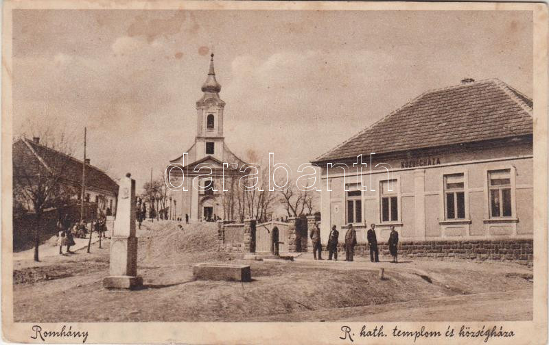 Romhány, Római katolikus templom, községháza (EK) https://www.darabanth.com/de/230-Fernauktion/230.0/Ansichtskarten/Ungarn~4/Romhany-Romai-katolikus-templom-kozseghaza-EK~II1036983