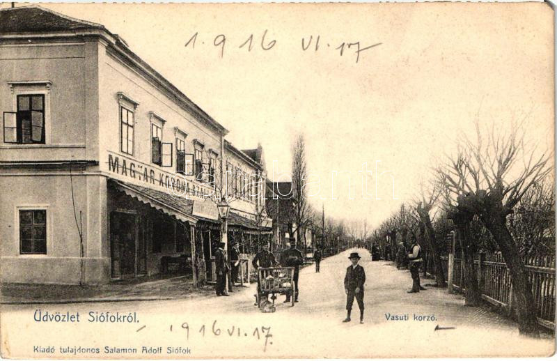Beschreibung: Siófok, Vasúti korzó, Magyar Korona Szálloda, kiadó tulajdonos Salamon Adolf