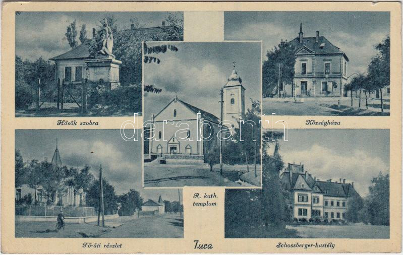 Tura, Hősök szobra, községháza, Fő út, Római katolikus templom, Schoss... https://www.darabanth.com/de/230-Fernauktion/230.0/Ansichtskarten/Ungarn~4/Tura-Hosok-szobra-kozseghaza-Fo-ut-Romai-katolikus-templom-Schossberger-kastely~II1036174