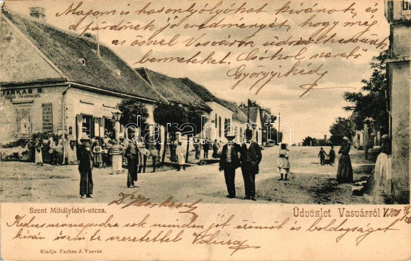 Vasvár, Szent Mihály utca, Farkas S. kereskedése, kiadja Farkas J. (ki... https://www.darabanth.com/de/230-Fernauktion/230.0/Ansichtskarten/Ungarn~4/Vasvar-Szent-Mihaly-utca-Farkas-S-kereskedese-kiadja-Farkas-J-kis-szakadas-small-tear~II1031189