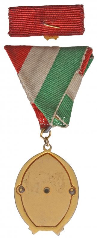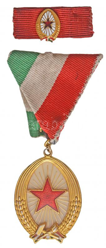Beschreibung: 1964. "Munka Érdemrend" arany fokozata, aranyozott, zománcozott Br kitüntetés nem saját mellszalaggal, miniatűrrel szalagsávon T:2