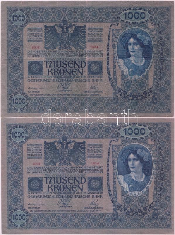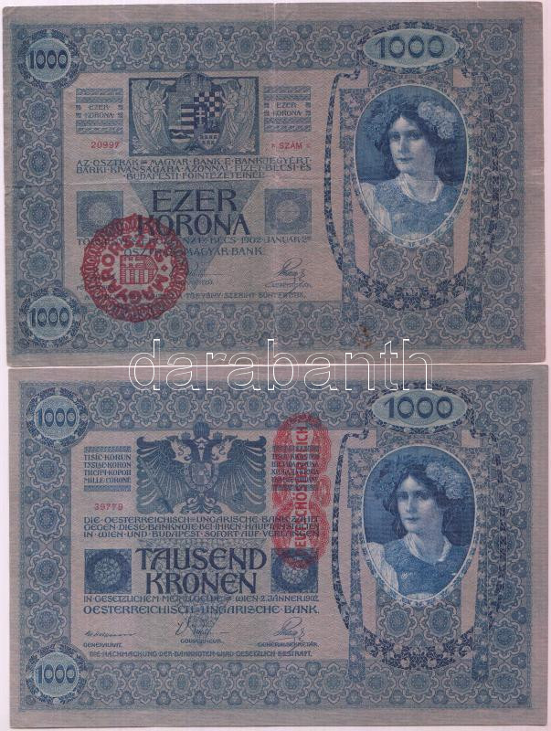 1902. 1000K (2x), egyik piros "MAGYARORSZÁG" körbélyegzővel, a másik p... https://www.darabanth.com/de/230-Fernauktion/230.0/Numismatik/Ungarische-Banknoten~400008/1902-1000K-2x-egyik-piros-MAGYARORSZAG-korbelyegzovel-a-masik-piros-Deutschosterreich~II1036696