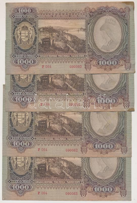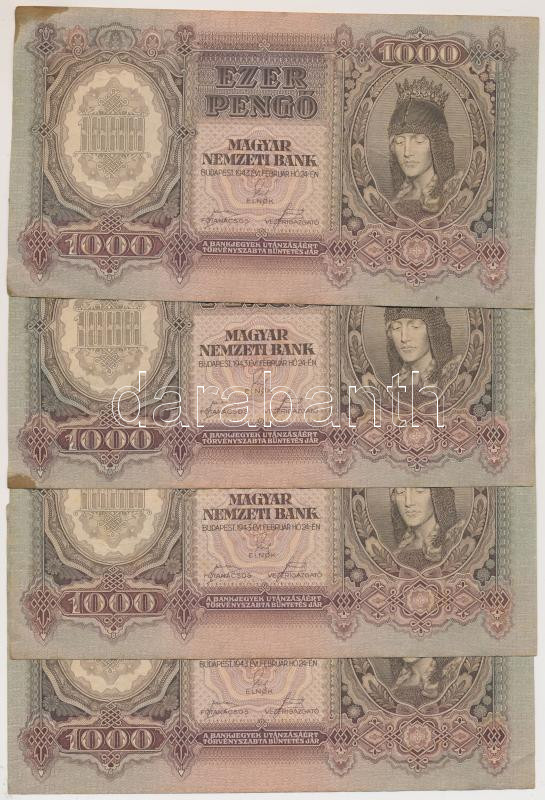1943. 1000P (4x) sorszámkövetők T:II (hajtatlanok) folt, egyiken tűlyu... https://www.darabanth.com/de/230-Fernauktion/230.0/Numismatik/Ungarische-Banknoten~400008/1943-1000P-4x-sorszamkovetok-TII-hajtatlanok-folt-egyiken-tulyuk~II1034648