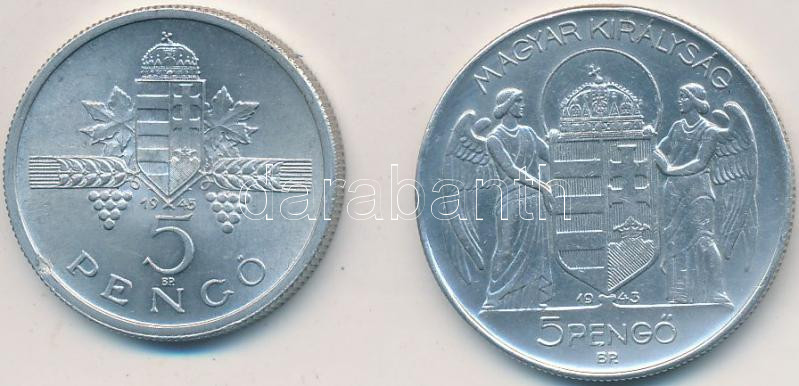 1943. 5P Al "Horthy Miklós születésének 75. évfordulója" + 1945. 5P Al... https://www.darabanth.com/de/230-Fernauktion/230.0/Numismatik/Ungarische-Munzen~400020/1943-5P-Al-Horthy-Miklos-szuletesenek-75-evforduloja-plus-1945-5P-Al-Parlament-T2~II1032463