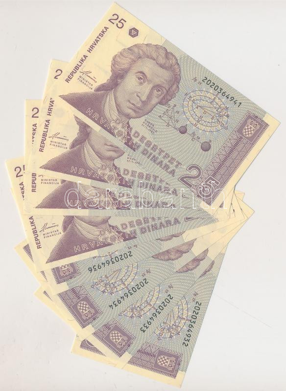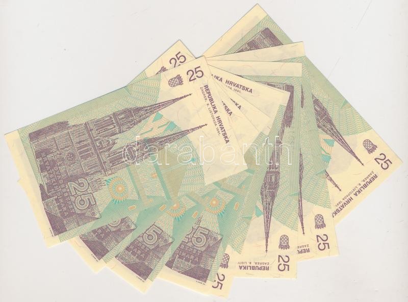 Horvátország 1991. 25D (8x) sorszámkövetők, illetve közeli sorszámúak ... https://www.darabanth.com/de/230-Fernauktion/230.0/Numismatik/Weltweit-Banknoten~400012/Horvatorszag-1991-25D-8x-sorszamkovetok-illetve-kozeli-sorszamuak-TI-3Cbr3ECroatia-1991~II1031457