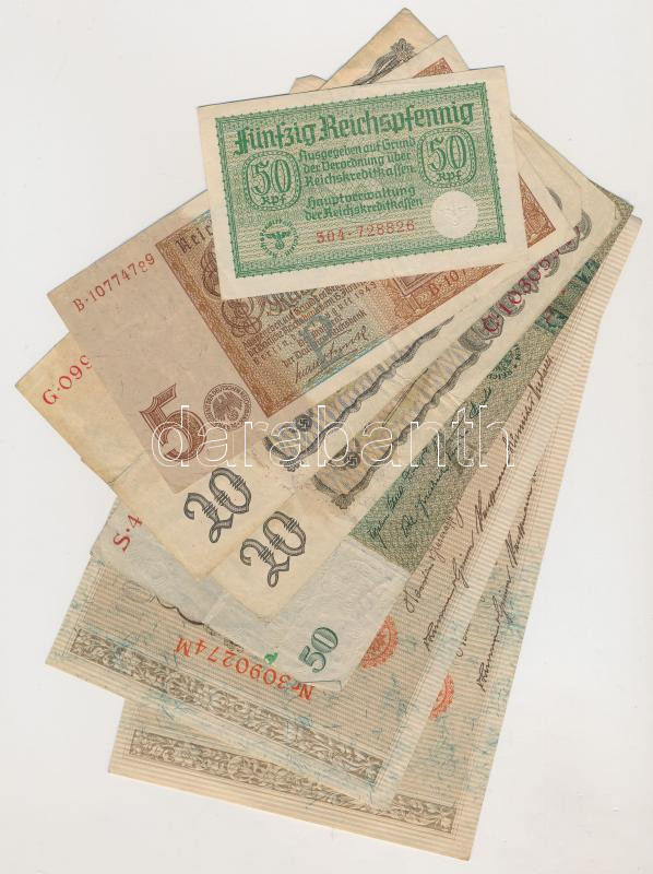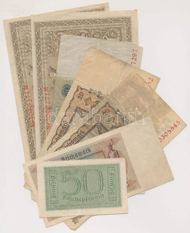 Német Birodalom 1910. 1000M (2x) hétjegyű sorszám, piros pecsét + Németország / Weimari Köztársaság 1933. 50M + Német 3. Birodalom 1939. 20M (2x) + 1940. 50pf + 1942. 5M T:vegyes