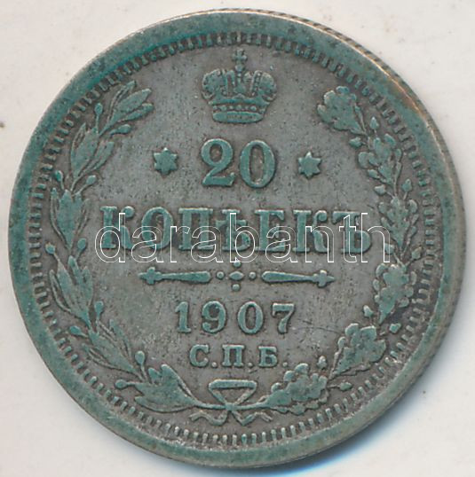 Russian Empire 1907. 20 Kopek... https://www.darabanth.com/de/230-Fernauktion/230.0/Numismatik/Weltweit-Munzen~400013/Orosz-Birodalom-1907-20k-Ag-T2-patina-3Cbr3ERussian-Empire-1907-20-Kopeks-Ag-CVF-patina~II1036518