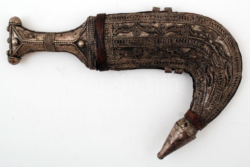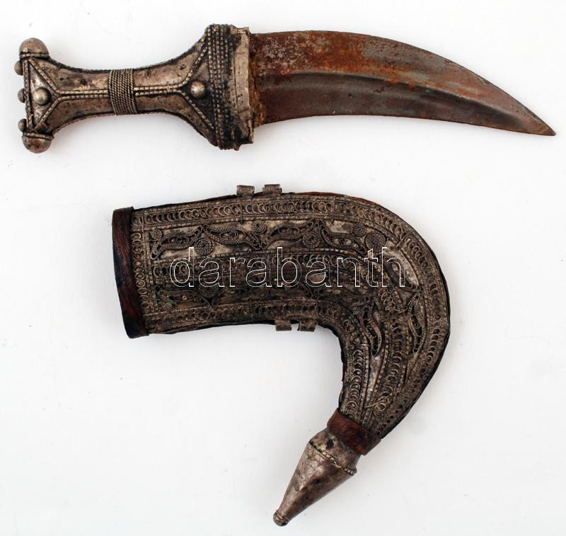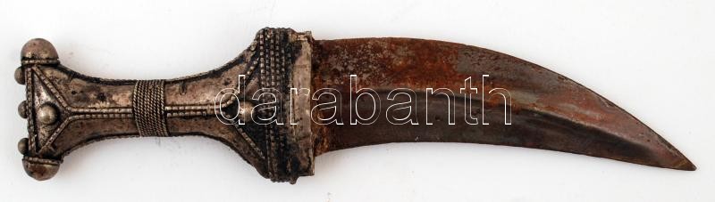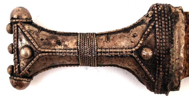 Afrikai antik kézműves, hajlított pengéjű törzsi tőr. Díszes bőr tokban, filigrán fém rátétes díszítéssel / Antique African tribal dagger in ornamented leather case with filigrane metal ornaments 20 cm