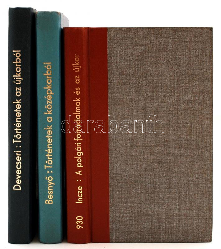 3 db történelmi témájú könyv: Incze Miklós, Makkai László: A polgári forradalmak és az újkor. Bp., 1969, Minerva. Későbbi félvászon kötésben, jó állapotban.; Besnyő Miklós: Történetek a középkorból. Történelmi olvasókönyv az általános iskola 6. osztálya tanulói számára. Bp., 1971, Tankönyvkiadó. Későbbi félvászon kötésben, jó állapotban.; Devecseri Lászlóné, Major József: Történetek az újkorból. Történelmi olvasókönyv az általános iskola 7. osztálya számára. Bp., 1974, Tankönyvkiadó. Későbbi vászonkötésben, jó állapotban.