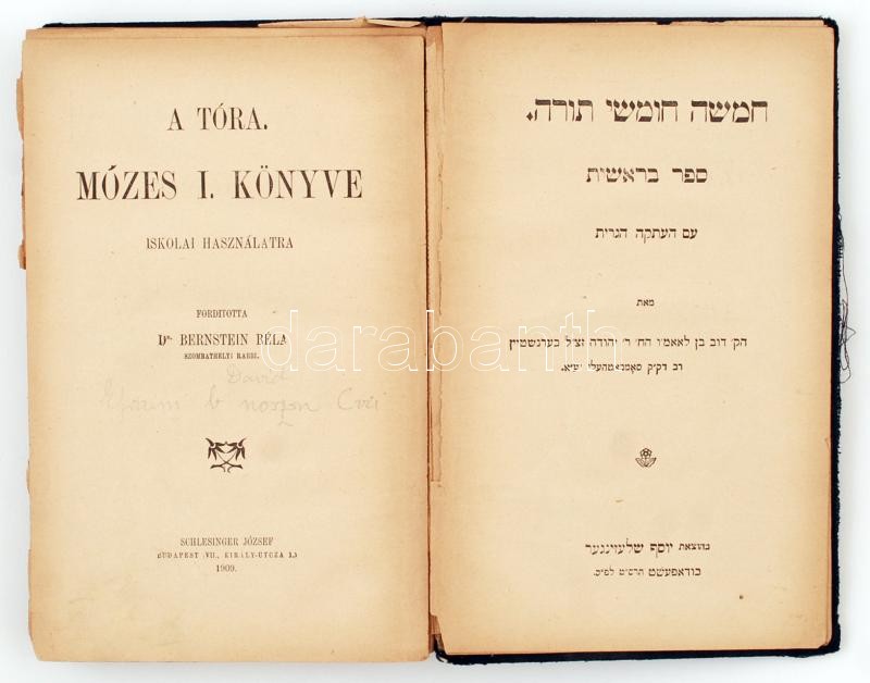 A Tóra. Mózes I. könyve iskolai használatra. Ford. Bernstein Béla. Bp., 1909, Schlesinger József. Magyar-héber bilingvis kiadás. Kopott vászonkötésben, gerince hiányzik, néhány lap kijár.