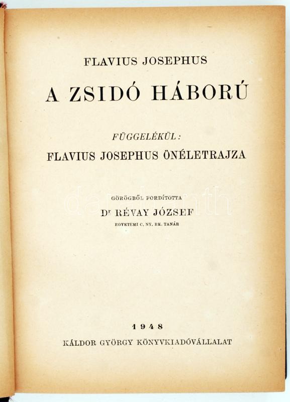 Flavius Josephus: A zsidó háború. Ford.: Révay József. Bp., 1948, Káld... https://www.darabanth.com/de/231-Fernauktion/231.0/Andere-Sammelgebiete/Bucher-Judaica~600036/Flavius-Josephus-A-zsido-haboru-Ford-Revay-Jozsef-Bp-1948-Kaldor-Gyorgy-Konyvkiadov~II1045964