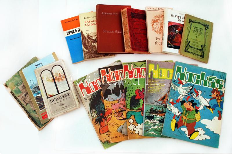 Kis doboznyi érdekes könyv-Fekete István: Karácsonyi látogatók; Dr. Hermann Göll: Illustrierte Mythologie der Hellenen, Römer, Germanen, Iranier und Inder; Pajkos énekek. Bp., 1984, Szépirodalmi Könyvkiadó; Madách Imre: Az ember tragédiája; Kockás füzetek, stb.