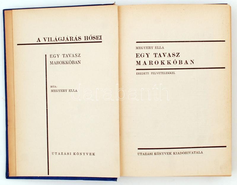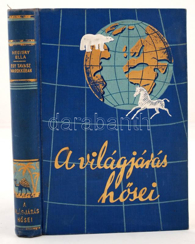 Megyery Ella: Egy tavasz Marokkóban. Eredeti felvételekkel. A világjárás hősei. Bp., Utazási Könyvek Kiadóhivatala. Kiadói aranyozott, festett egészvászon kötés, fotókkal illusztrált, jó állapotban.