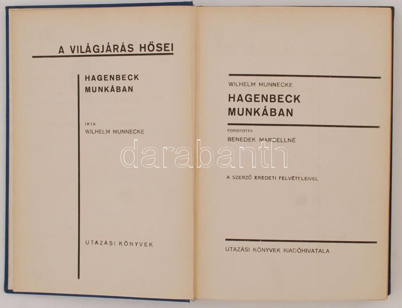 Wilhelm Munnecke: Hagenbeck munkában. A világjárás hősei. Fordította: Benedek Marcellné. Bp., Utazási Könyvek Kiadóhivatala. Kiadói aranyozott egészvászon kötés, jó állapotban.
