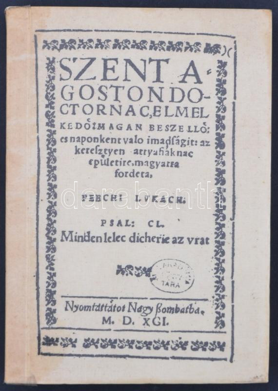 Szent Ágoston: Szent Ágoston doctornac elmélkedő magánbeszélő és naponként való imádságai. Ford.: Pécsi Lukács. Nagyszombat, 1591. Facsimile kiadás, [Bp.], [1988], [MTA Irodalomtudományi Intézet]. Melléklet nélkül. Papírkötésben, jó állapotban.