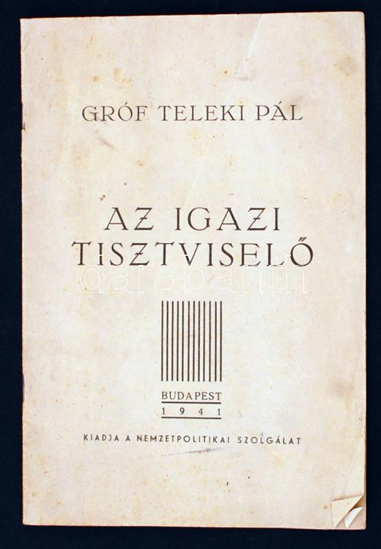 Teleki Pál: Az igazi tisztviselő. Bp., 1941, Nemzetpolitikai Szolgálat... https://www.darabanth.com/de/231-Fernauktion/231.0/Andere-Sammelgebiete/Bucher-Sonstige-Raritaten~600041/Teleki-Pal-Az-igazi-tisztviselo-Bp-1941-Nemzetpolitikai-Szolgalat-Kicsit-szakadozott-papir~II1043864