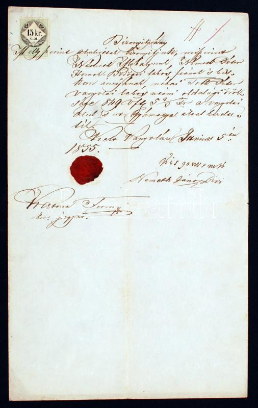 1855 Vanyola(Veszprém megye), Kézzel írott okmány szép viaszpecséttel,... https://www.darabanth.com/de/231-Fernauktion/231.0/Andere-Sammelgebiete/Dokument~600015/1855-VanyolaVeszprem-megye-Kezzel-irott-okmany-szep-viaszpecsettel-15-kr-CM-okmanybely~II1042650