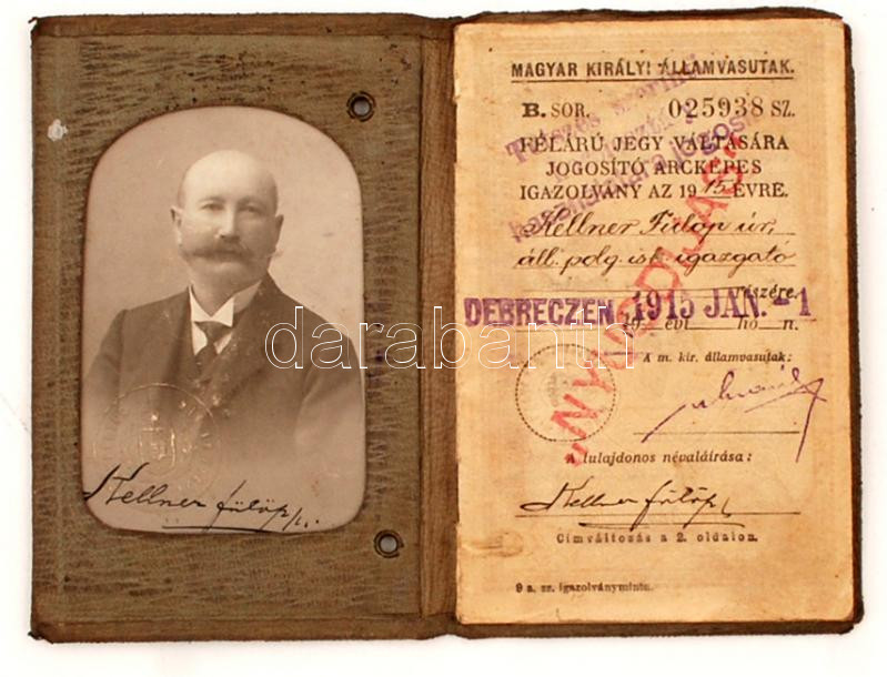 Beschreibung: 1915 Debrecen, A Magyar Királyi Államvasutak által polgári iskolai igazgató részére kiállított, félárú jegy váltására jogosító igazolványa