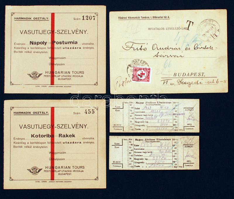1930-1943 A Fővárosi Közmunkák Tanácsának hivatalos levelezőlapja, a Hungarian Tours vasúti jegy szelvénye(2 db), Magyar Általános Kőszénbánya Részvénytársualt 2 db szállítási jegye