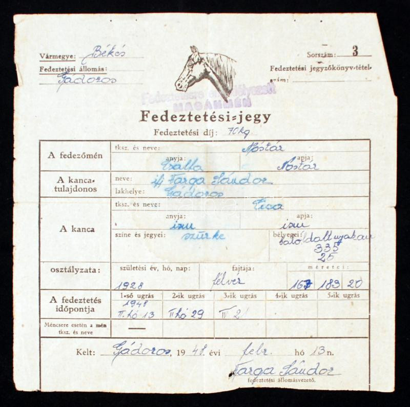 1948 Gádoros, Fedeztetési jegy a a fedezőmén és a kanca adatainak felt... https://www.darabanth.com/de/231-Fernauktion/231.0/Andere-Sammelgebiete/Dokument~600015/1948-Gadoros-Fedeztetesi-jegy-a-a-fedezomen-es-a-kanca-adatainak-feltuntetesevel~II1018433