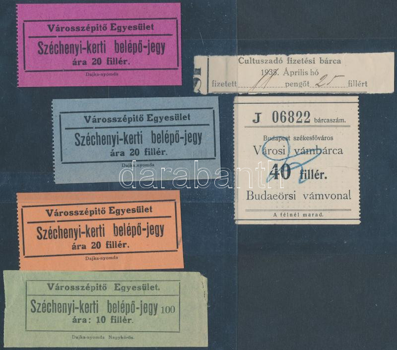 Beschreibung: cca 1920-1940 A Városszépítő Egyesület Széchenyi-kerti belépőjegye, 4 db; Cultuszadó fizetési bárca, városi vámbárca