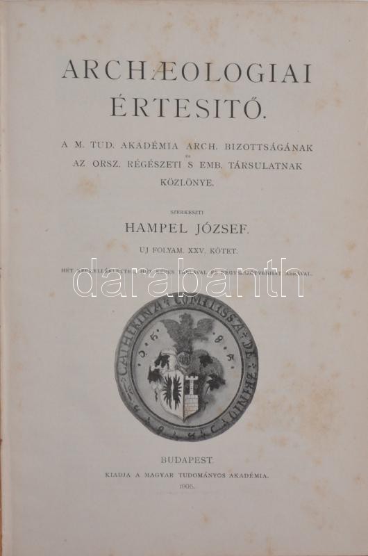 1905 Archeologiai Értesítő - A M. Tud. Akadémia arch, bizottságának, az Orsz. régészeti s Emb társulat közlönye. Szerk. Hampel József. Uj folyam XXV. Komplett évfolyam.