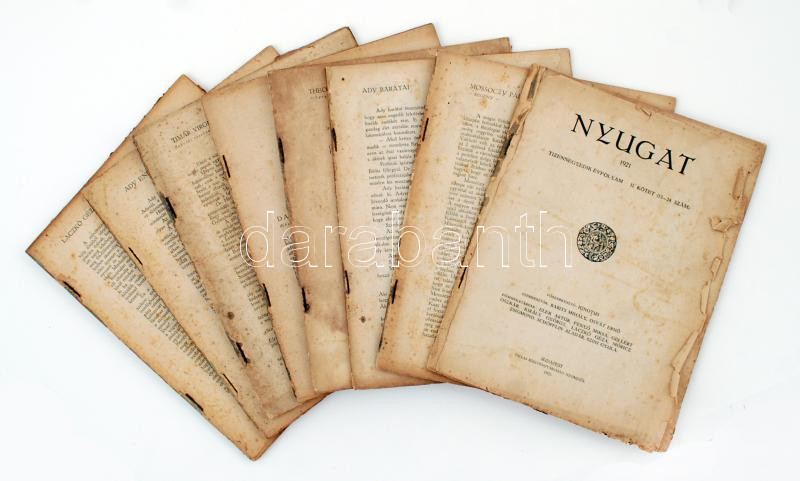 1921 A Nyugat című folyóirat XIV. évfolyamának II. kötete(13-24. szám), benne Babits Mihály, Kosztolányi Dezső és mások írásaival, kötés nélkül, szétesett állapotban
