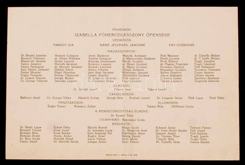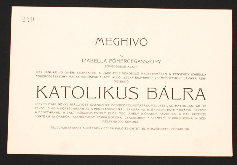 Beschreibung: 1925 Meghívó az Izabella főhercegasszony védnöksége alatt a "Szent Erzsébet Gyermekotthon" javára rendezendő katolikus bálra