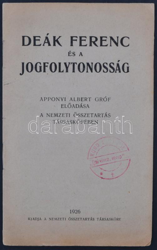1926 Deák Ferenc és a jogfolytonosság. Apponyi Albert gróf előadása a Nemzeti összetartás társaskörében. 1926, Kiadja a Nemzeti Összetartás Társasköre, Pallas.
