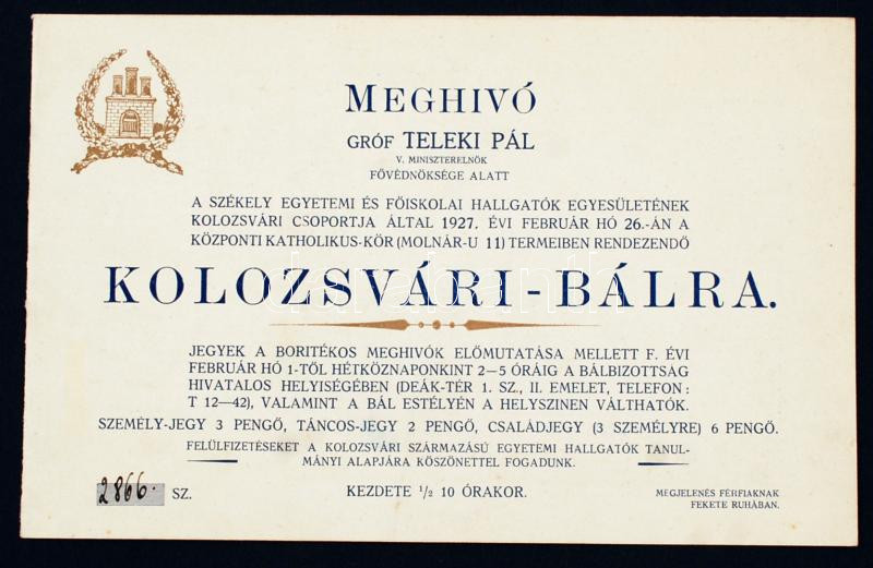1927 Meghívó a Gróf Teleki Pál védnöksége alatt álló Székely Egyetemi és Főiskolai Hallgatók Egyesületének kolozsvári csoportja által rendezett kolozsvári bálra, benne a védnökök és rendezők nevének felsorolásával