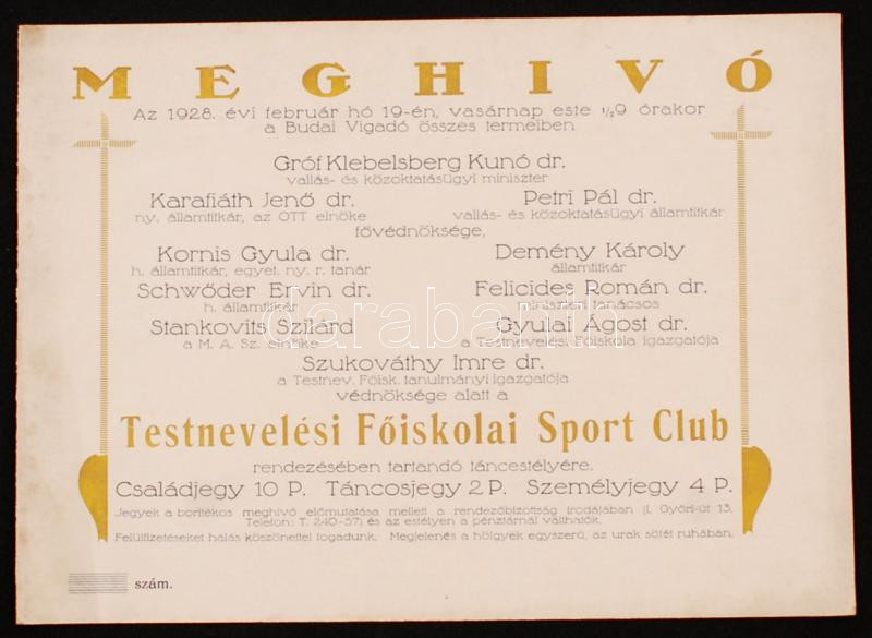 1928 Meghívó a Gróf Klebelsberg Kunó, Karafiáth Jenő, Kornis Gyula és mások védnöksége alatt rendezendő Testnevelési Főiskolai Sport Club táncestélyére