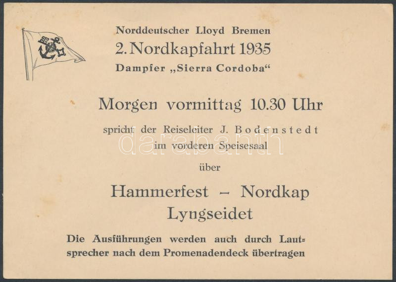 1935 2. Nordkapfahrt Sierra Cordoba - Északi Sarki hajóút hajójegye / ... https://www.darabanth.com/de/231-Fernauktion/231.0/Andere-Sammelgebiete/Drucksachen~600027/1935-2-Nordkapfahrt-Sierra-Cordoba--Eszaki-Sarki-hajout-hajojegye-North-Pole-journey-ship-tr~II1039450