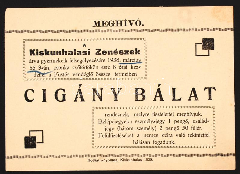 Beschreibung: 1938 Kiskunhalas, Meghívó a Kiskunhalasi Zenészek árva gyermekek felsegélyezésére rendezett cigány báljára