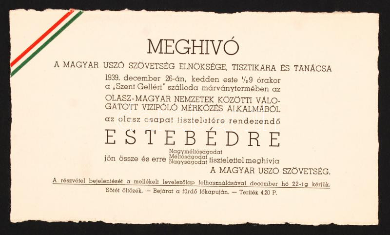 1939 Meghívó a Magyar Úszó Szövetség Elnöksége, Tisztikara és Tanácsa által a Szent Gellért Szálloda Márványtermében az olasz-magyar vízilabda-mérkőzés alkalmából rendezett estebédre