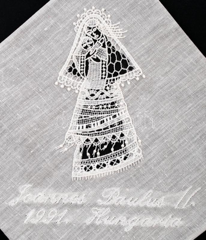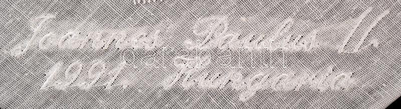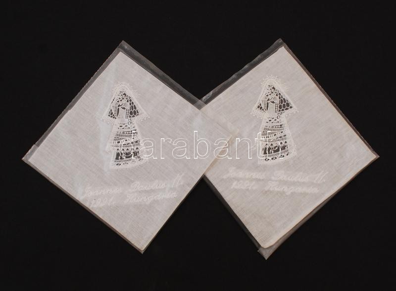 Beschreibung: 2 darab, II. János Pál pápa 1991. évi magyarországi látogatása alkalmából készült halasi csipke terítő, cca 34x34 cm