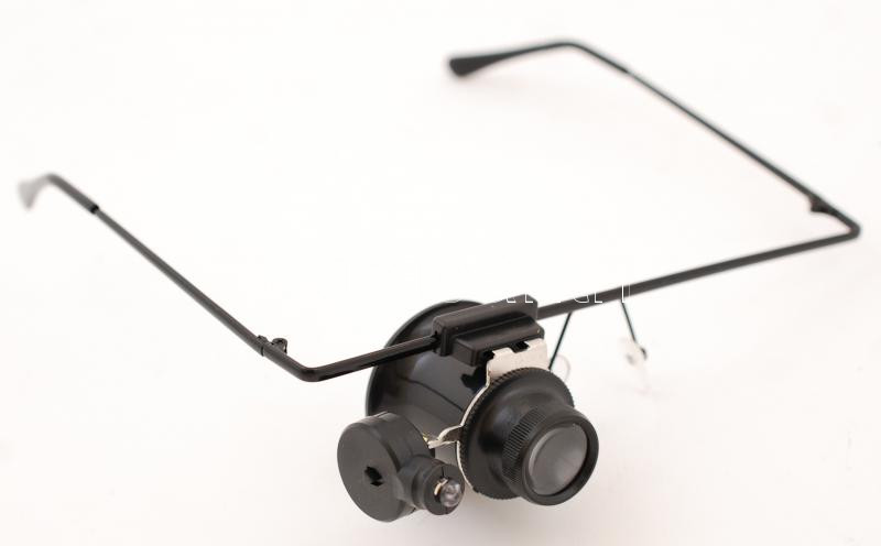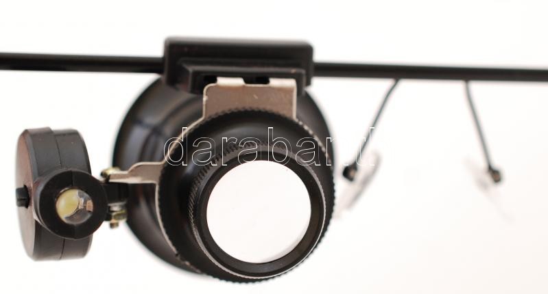 Beschreibung: 20-szoros nagyítású szemüveg lupé, állítható LED-es lámpával, műanyag tokban, működik